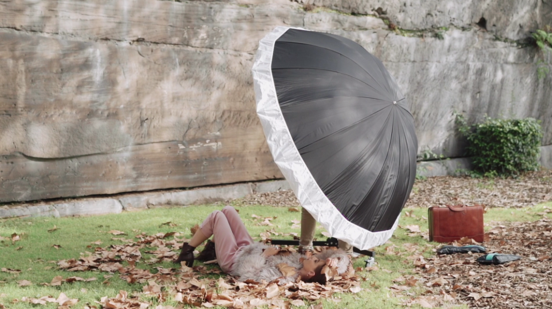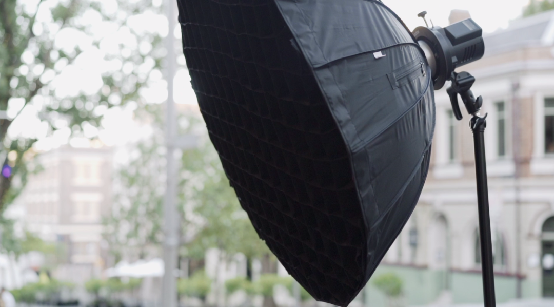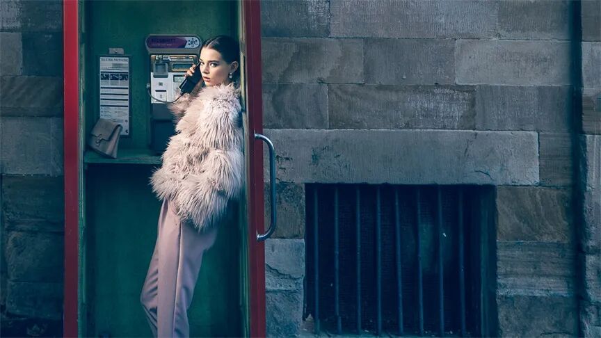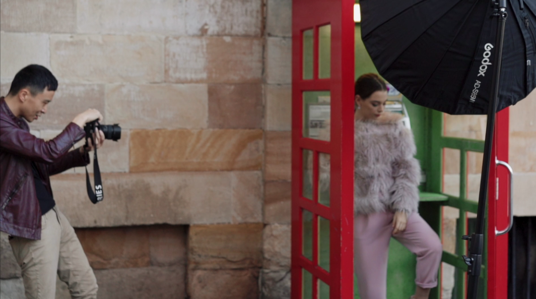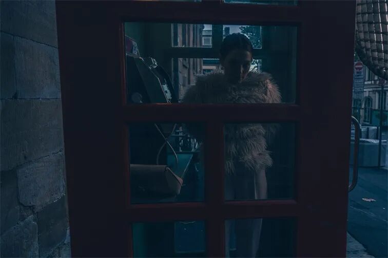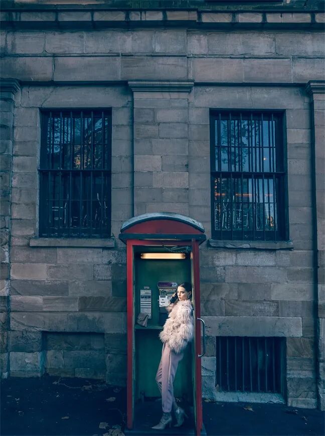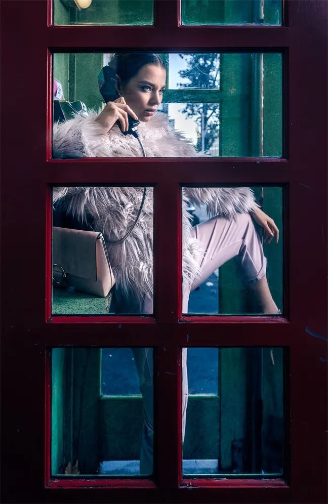 我们找到一个电话亭,常规拍摄的话有点普通。这里的技巧是2.5档欠曝环境光,使用AD300pro对模特进行补光,AD-S85W柔光箱使用网格使光线更柔和且集中。