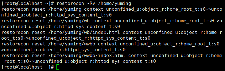 讯享网[root@localhost ~]# restorecon -Rv /home/yuming