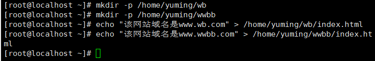 [root@localhost ~]# echo "该网站域名是www.wwbb.com" > /home/yuming/wwbb/index.html