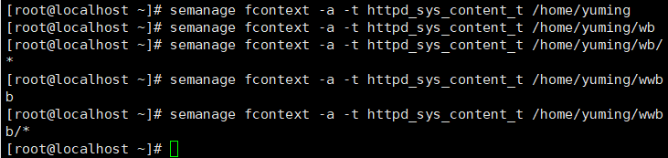 [root@localhost ~]# semanage fcontext -a -t httpd_sys_content_t /home/yuming/wwbb/*