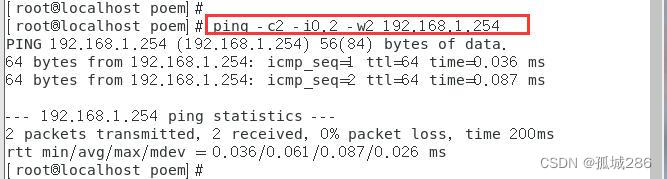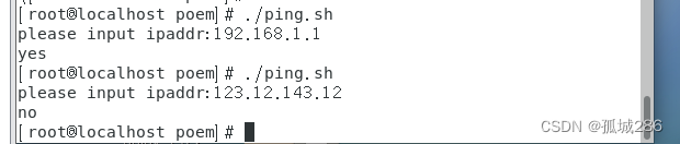 讯享网[root@localhost poem]# vim ping.sh ——创建编写文件 1 #!/bin/bash 2 if `ping -c2 -i0.2 -w2 192.168.123.124 &> /dev/null` 3 then echo "yes" 4 else echo "no" 5 fi [root@localhost poem]# chmod +x ping.sh ——赋权 [root@localhost poem]# ./ping.sh ——执行 no ——输出结果 [root@localhost poem]#
