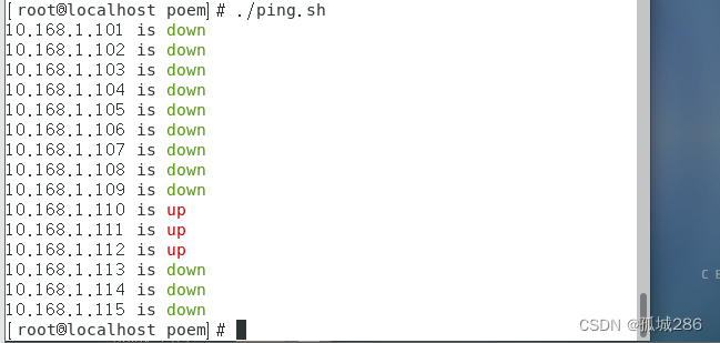 [root@localhost poem]# vim ping.sh 1 #!/bin/bash 2 NET=10.168.1. 3 IP=100 4 while [ $IP -lt 115 ] 5 do 6 let IP++ 7 if `ping -c2 -i0.2 -w2 $NET$IP &> /dev/null` 8 then echo -e "$NET$IP is \033[31mup\033[0m" 9 else echo -e "$NET$IP is \033[32mdown\033[0m" 10 fi 11 done