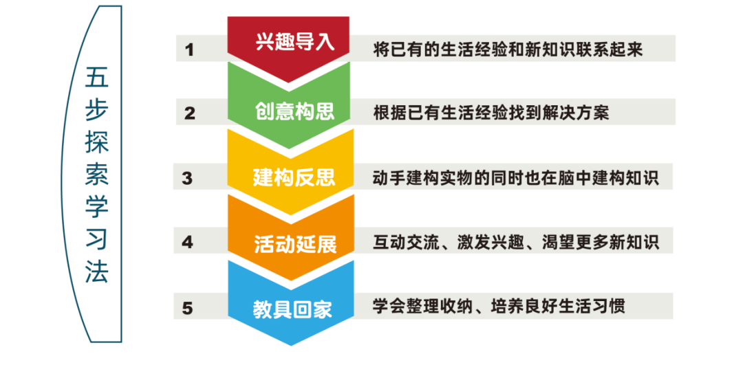 在兴趣参与、创意构思、建构反思、活动延展、教具回家五步探索学习法的指导下,把游戏活动的主题交给孩子,让孩子在快乐主动的探究中获取知识,提高能力。