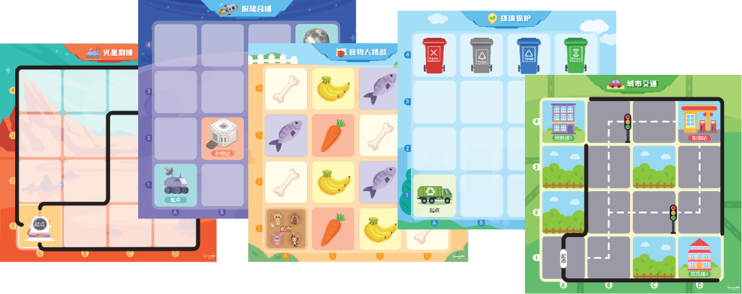 设计各种主题的场地图,告别单一造型搭建和编程,利用多场景吸引幼儿主动了解任务目标,提高编程指令学习的效率。