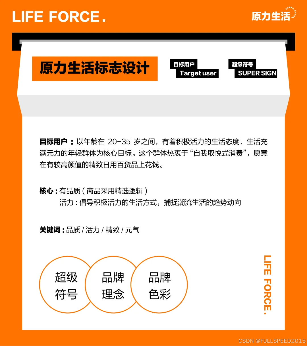 全速为“原力生活”设计的Logo选用了活力橙作为主色调,这一色彩富有活力和年轻感。同时,活力橙不仅符合目标用户的审美和偏好,有助于树立品牌形象,也与品牌的愿景和服务特点相一致,有助于塑造品牌形象,提高品牌在目标市场中的竞争力。