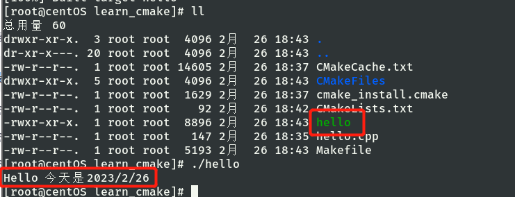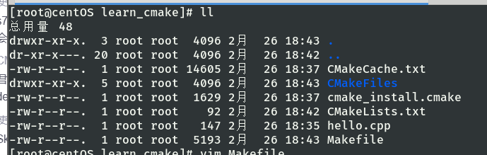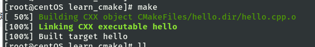 [root@centOS learn_cmake]# cmake .CMake Deprecation Warning at CMakeLists.txt:1 (cmake_minimum_required): Compatibility with CMake < 2.8.12 will be removed from a future version of CMake.Update the VERSION argument <min> value or use a …<max> suffix to tell CMake that the project does not need compatibility with older versions.– The C compiler identification is GNU 8.3.1– The CXX compiler identification is GNU 8.3.1– Detecting C compiler ABI info– Detecting C compiler ABI info - done– Check for working C compiler: /opt/rh/devtoolset-8/root/usr/bin/cc - skipped– Detecting C compile features– Detecting C compile features - done– Detecting CXX compiler ABI info– Detecting CXX compiler ABI info - done– Check for working CXX compiler: /opt/rh/devtoolset-8/root/usr/bin/c++ - skipped– Detecting CXX compile features– Detecting CXX compile features - done– Configuring done (1.0s)– Generating done (0.0s)– Build files have been written to: /root/learn_cmake