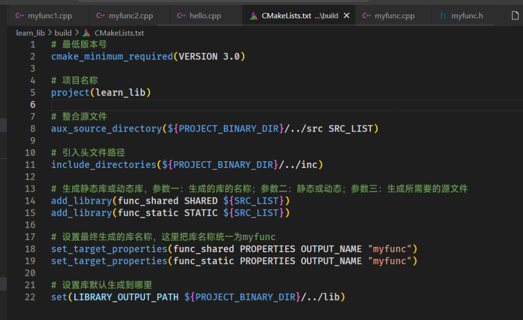 add_library(lib_name STATIC/SHARED src) # 函数作用:生成库。# 参数lib_name:是要生成的库名称,# 参数STATIC/SHARED:指定生成静态库或动态库,# 参数src:指明库的生成所需要的源文件