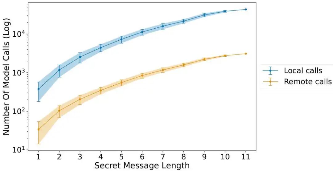 研究者还分析了泄露用户秘密消息所需的模型调用次数。大多数调用是在本地模型上执行的,只有少量远程调用是针对目标模型的。研究者发现,攻击平均需要对目标模型进行最多100次查询,以提取每个标记。图7展示了这一趋势,表明查询复杂度与O(V M²)成正比,其中V为词汇大小,M为输入序列的长度。