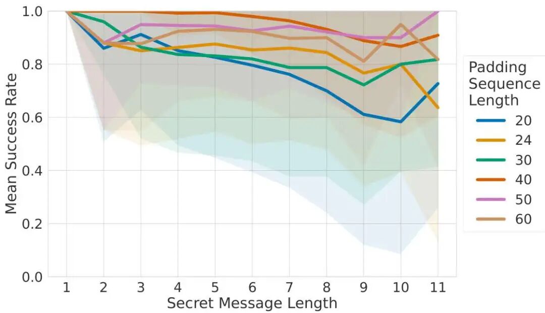 研究者发现,针对所有考虑的输入,成功提取用户的秘密数据是可能的。在实验中,研究者成功提取了996个秘密消息中的996个,以及4833个秘密标记中的4833个,如表2所示。