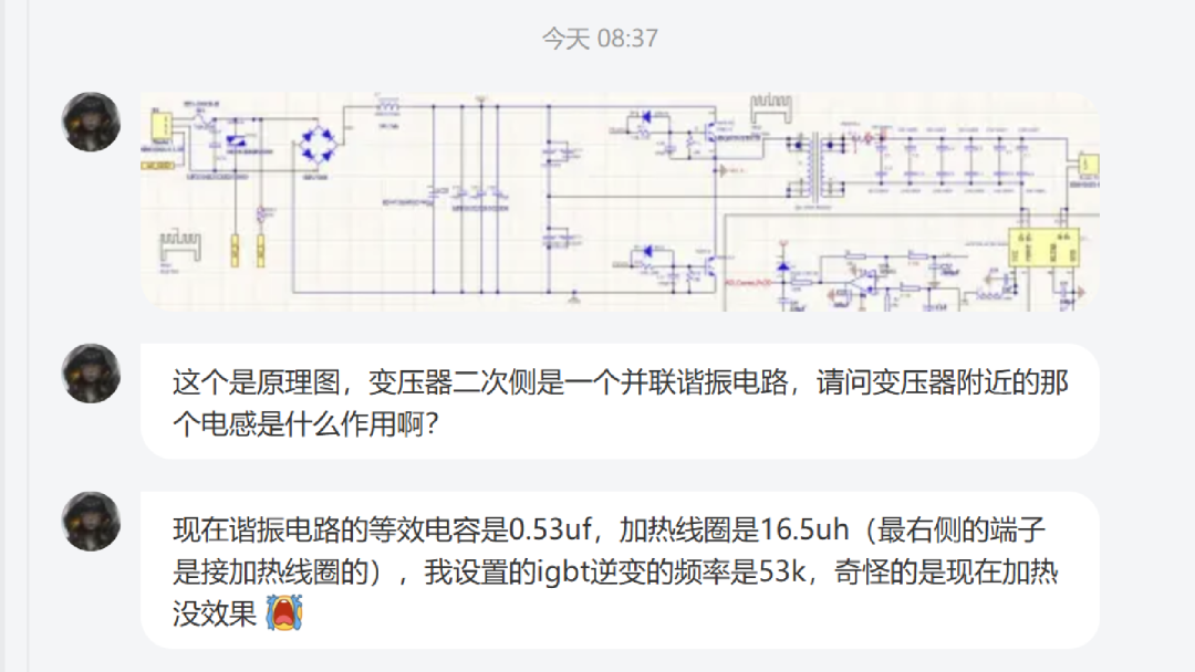 今天在B站看到朋友的留言,针对一款感应加热设备的电路图。他提出了两个问题。第一个就是在隔离变压器输出部分的电感是起到什么作用? 第二个就是根据负载感应线圈的电感以及输出并联谐振电容的数值,计算出谐振频率为53kHz,但为何没有功率输出,对负载进行加热。下面让我们来看一下这个两个有趣的问题。