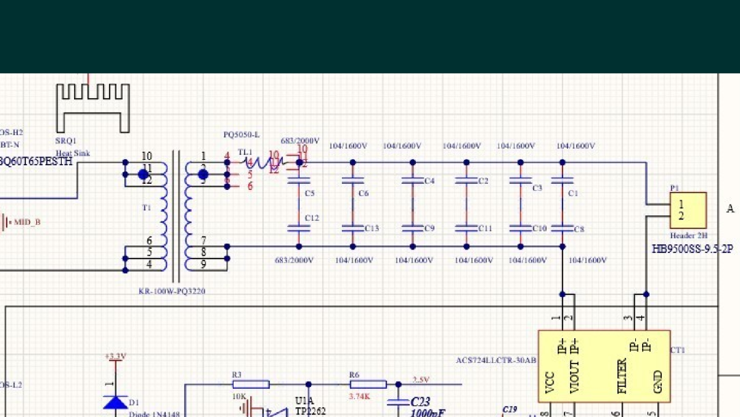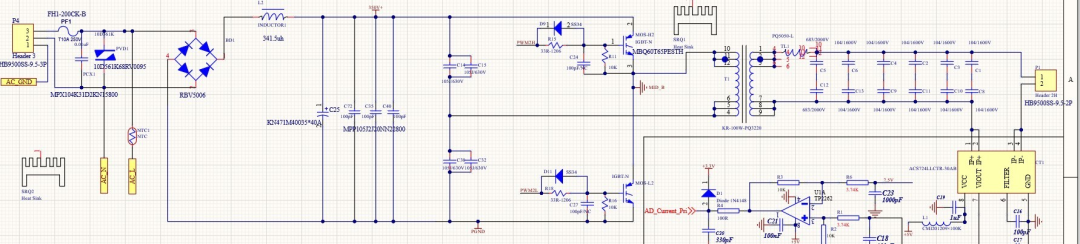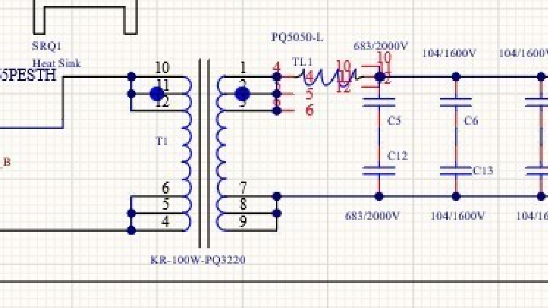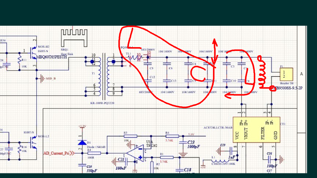 根据网友发送的电路图,可以看到设备电路的整体情况,左边是交流电整流滤波部分,通过 IGBT半桥驱动一个隔离变压器,变压器的副边为 LLC 负载电路。P1端口连接感应负载线圈。下面显示不全的电路为输出电流检测和保护电路。根据朋友的问题提问,让我们看一下隔离变压器副边这部分的电路。