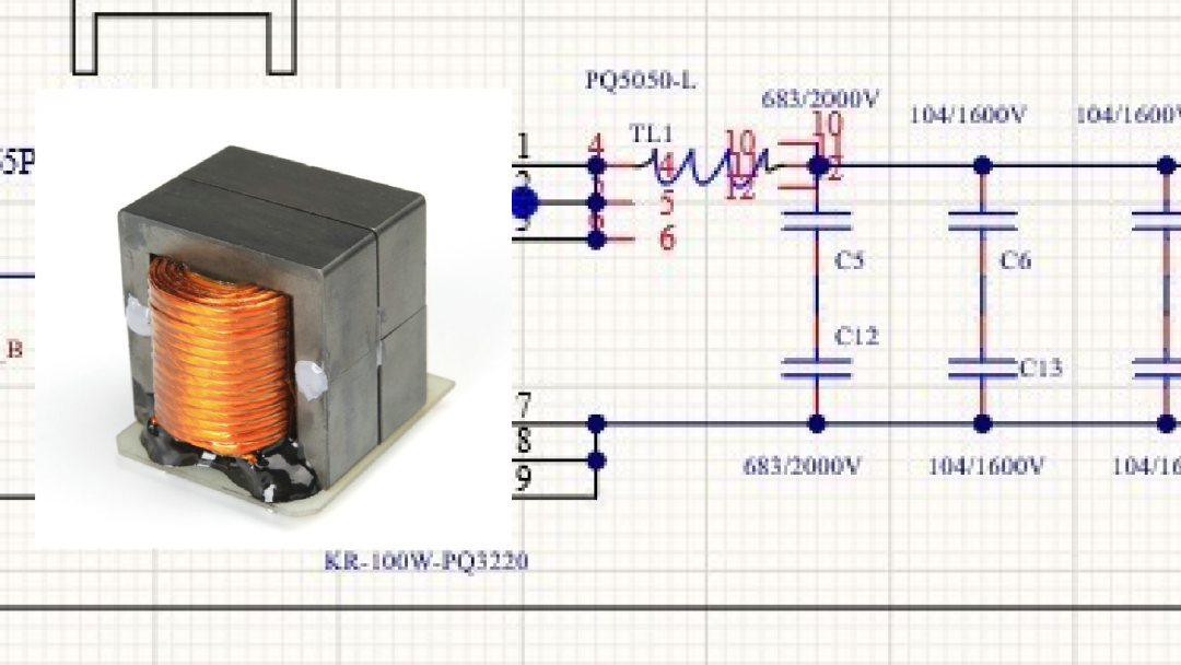 首先,对于这个隔离变压器的绘制,我感到比较疑惑。这些绕组的并联是几个意思? 是否说明这个变压器的输入,输出线圈是 1:1,而且都是三个线圈并联? 用于扩大输出电流的容量? 下面就是这个电感了。图中并没有给出电感的数值。电感的骨架为 PQ5050。这应该对应电感的尺寸。这是网络上给出的 PQ5050 对应的电感的形状。是一个大功率的电感。它与后面的谐振电容与产出负载电感组成 LLC 负载电路。不过,有一点令人感到疑惑,那就是隔离变压器的型号,PQ3220,似乎这个变压器的体积比 电路中 TL1 的体积还小。