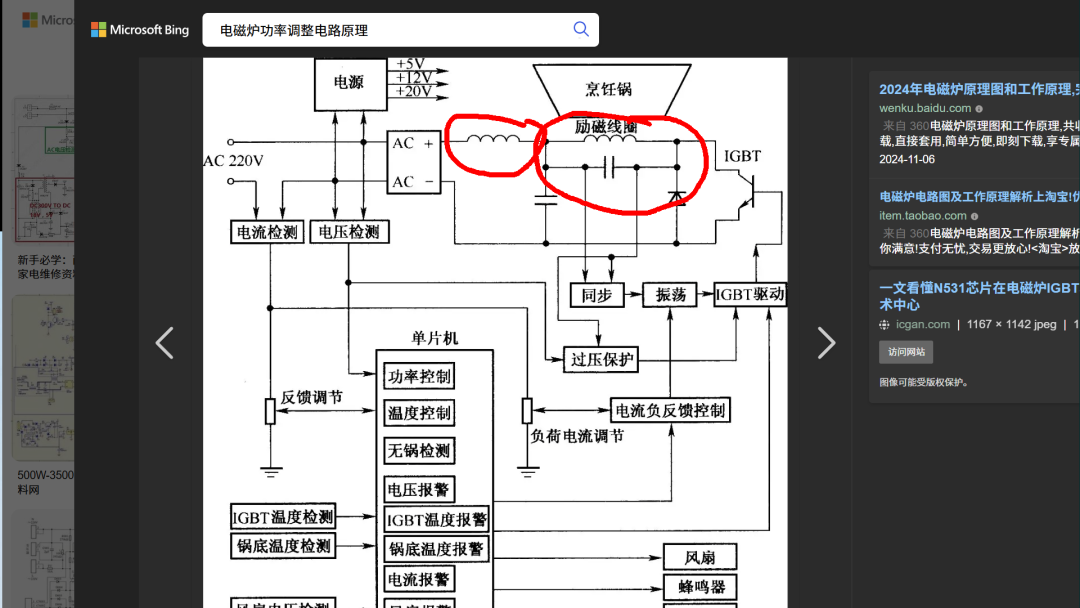 这让我想起来几年前拆卸的一个家用电磁炉的电路。可以看到,电磁炉使用了单个IGBT 驱动感应线圈,电路板上也有电感以及谐振电容。只是,家用电磁炉电路中的电感,是串联在整流输出输出电路中,它起到整流平波电感的作用,电路板上的电容 与感应线圈组成并联谐振回路。这个电路与前面网友给出的电路原理是不同的。
