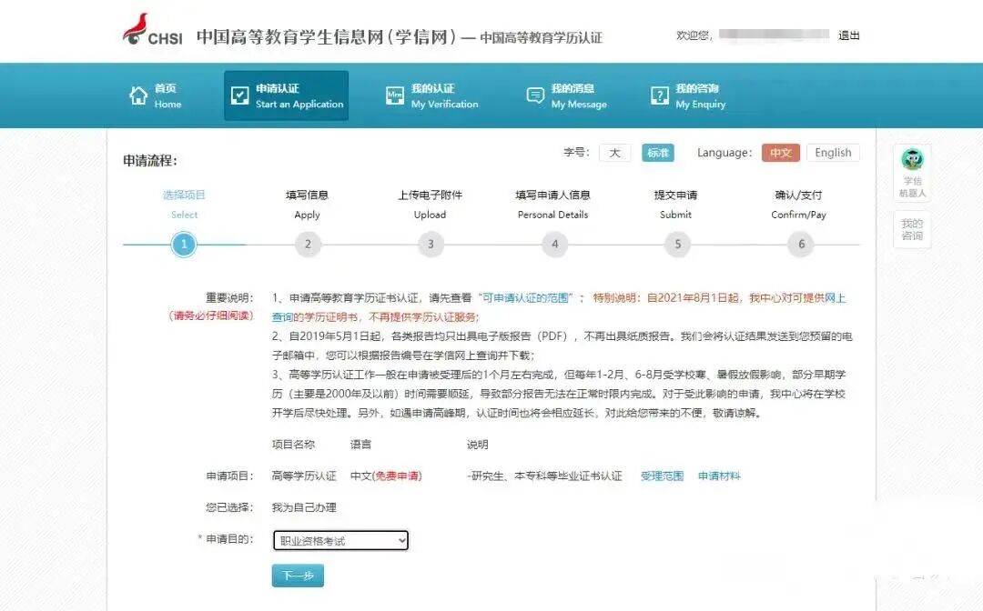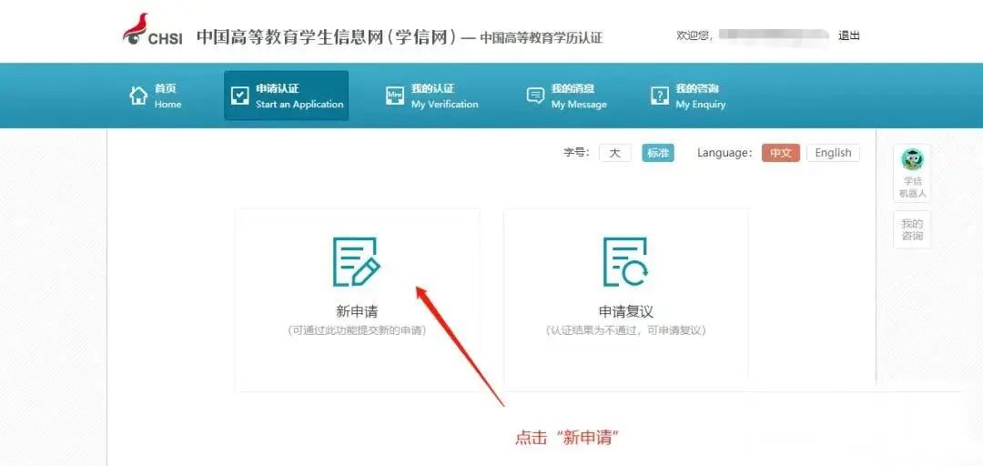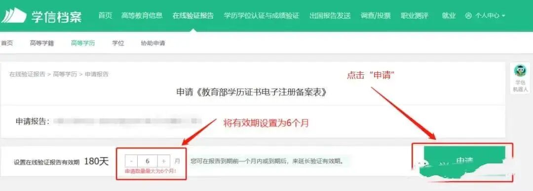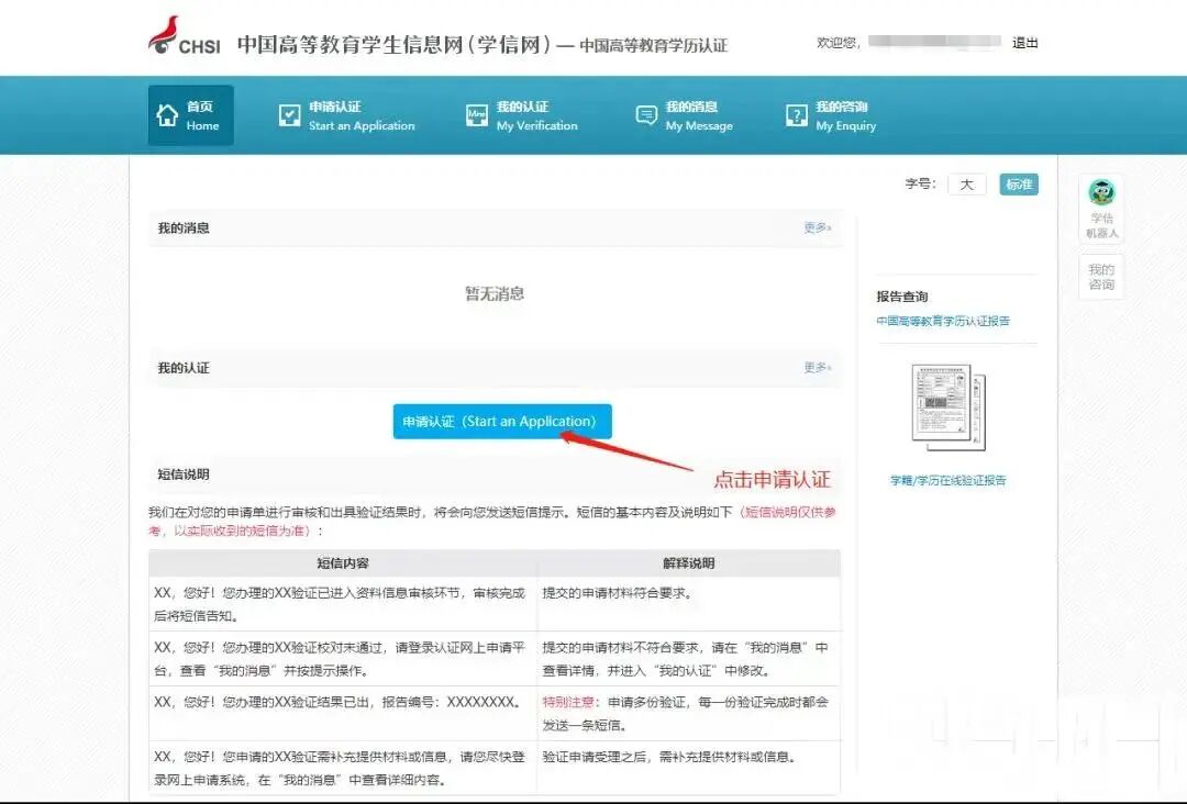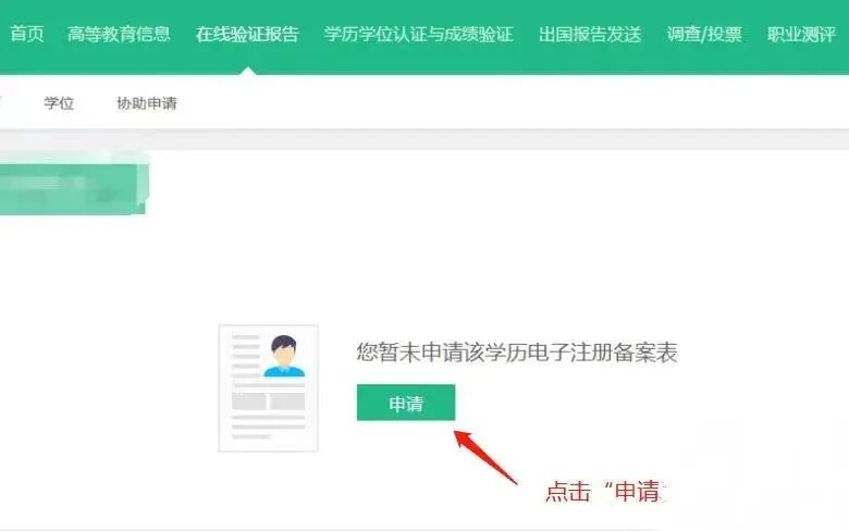 点击“中国高等教育学历认证报告”中的“网上申请”按钮