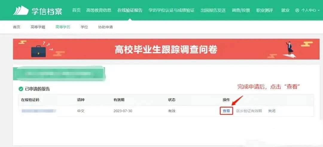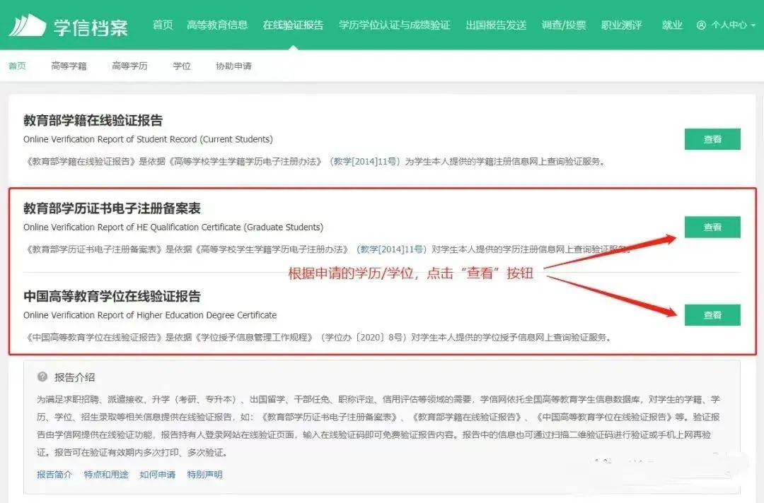 根据申请的学历/学位,点击“教育部学历证书电子注册备案表”或“中国高等教育学位在线验证报告”栏目的“查看”按钮