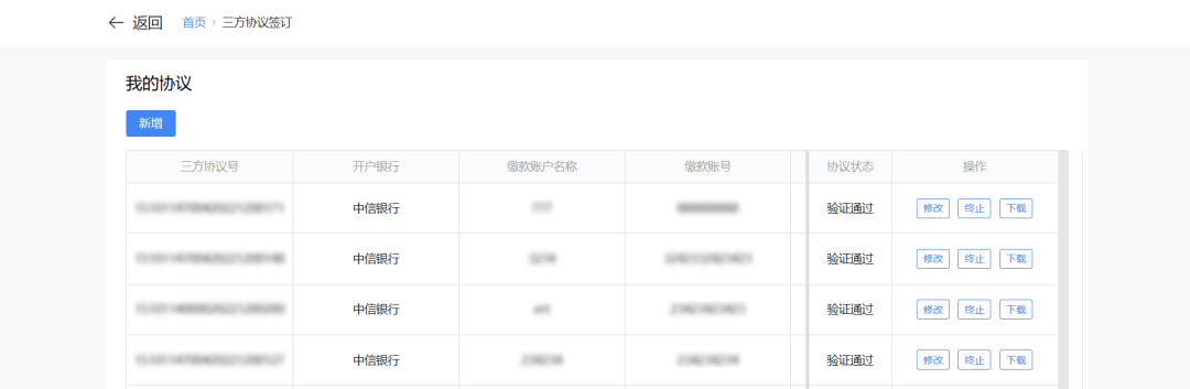 验证通过协议状态下,显示【修改】、【终止】和【下载】按钮,点击【修改】可跳转至委托划转协议书修改界面。可以对批扣标志进行修改,修改后点击【保存】。跳转至保存成功界面,点击【返回】可返回三方协议签订功能主界面。