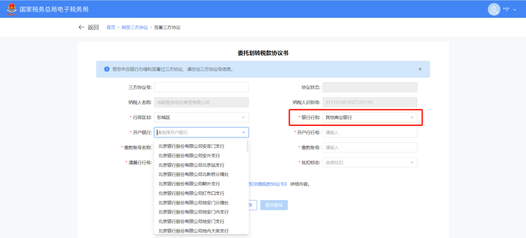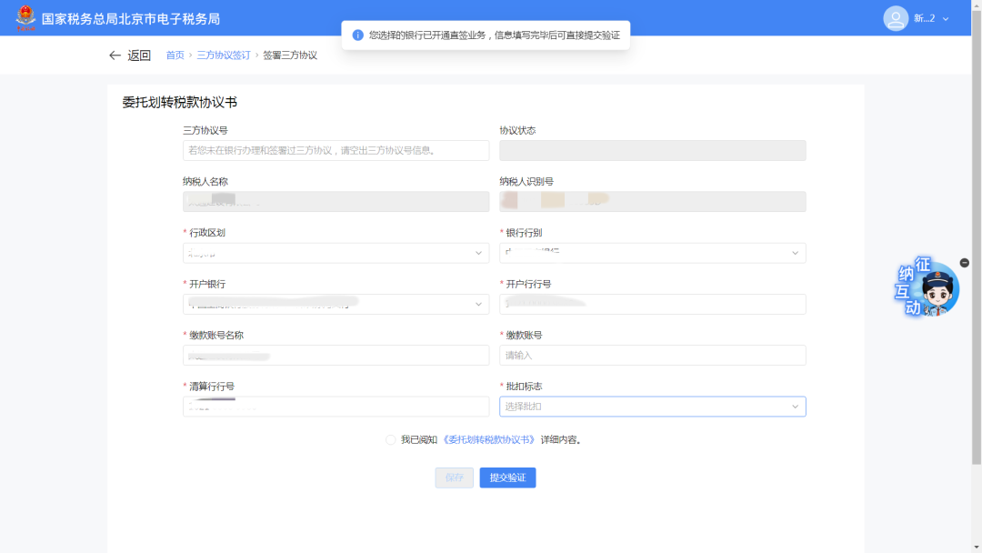 ①选择支持直签业务的银行时,提示“您选择的银行已开通直签业务,信息填写完毕后可直接提交验证”,点击【委托划转税款协议书】。