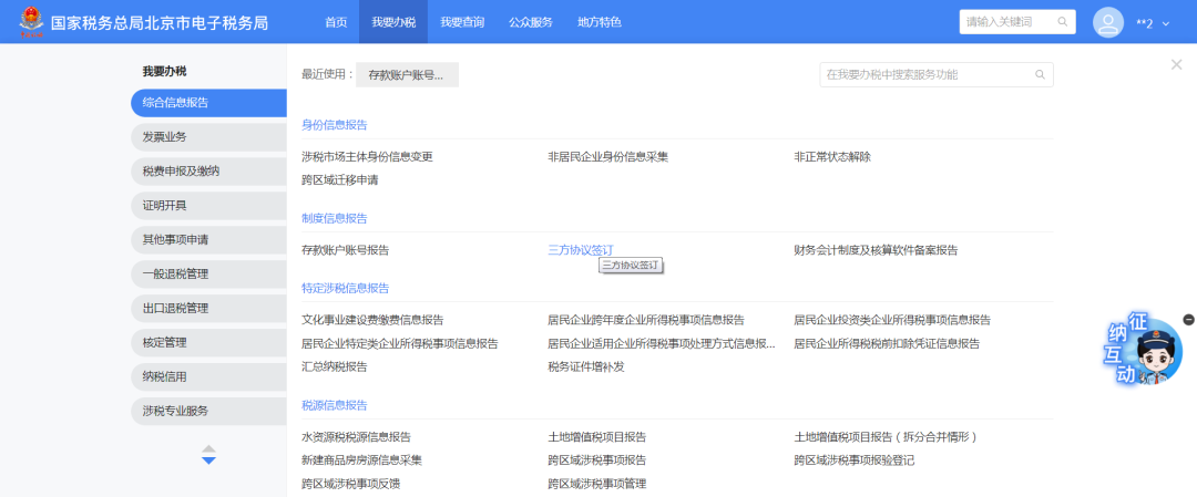 1.【我要办税】-【综合信息报告】-【制度信息报告】-【三方协议签订】。