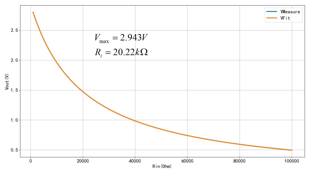 根据输入信号内阻和输出信号幅度之间的关系。利用电阻分压模型进行拟合,这样可以得到单管输入阻抗的大小。输入电阻大约为 14.5kΩ。