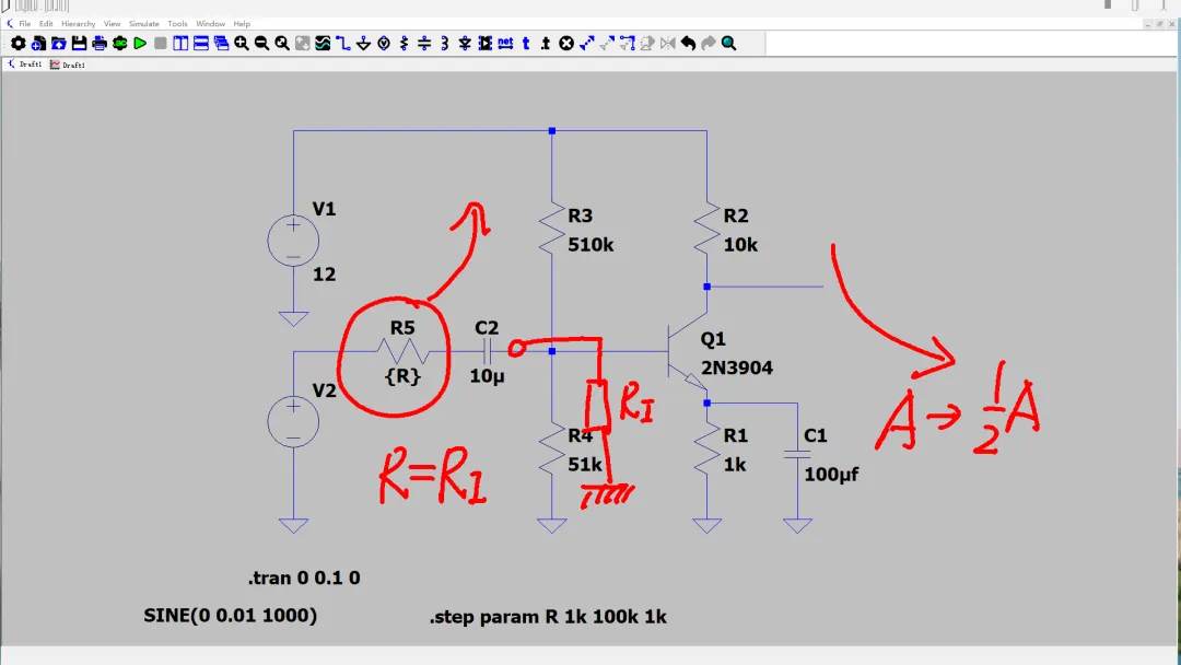 这是在 LTspice中搭建的单管反相共射电压放大电路。电阻 R5 与输入信号源串联。由于它的存在,使得输入信号在等效输入电阻上分压变小。随着 R5 的增加,输出电压信号就会下降。当 R5等于输入电阻的时候,输出放大信号的幅度就会降低一半。