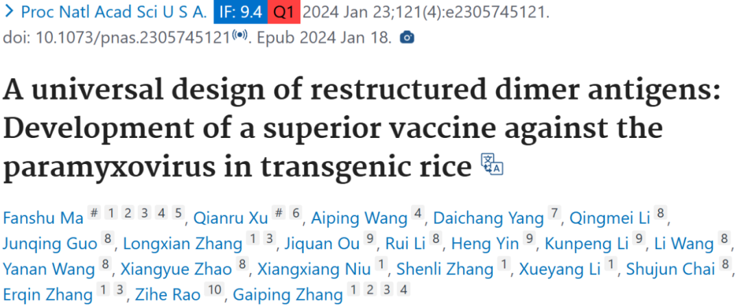 2024 年 1 月 18 日,河南农业大学动物医学院张改平院士、清华大学饶子和院士等人在 PNAS 期刊上发表题为「A universal design of restructured dimer antigens: Development of a superior vaccine against the paramyxovirus in transgenic rice」的文章,该文章针对疫苗研发面临的挑战提出「头 - 尾」二聚体疫苗模型,通过转基因水稻胚乳表达系统开发针对副粘病毒的疫苗。结构分析显示重组的血凝素-神经氨酸酶(HN)形成特殊四聚体,免疫实验表明其比原始 HN 及传统商业疫苗能更好地暴露关键表位,引发更快更强的免疫反应。低剂量的重组抗原即可完全保护鸡免受病毒致命挑战,证明其安全、有效、低剂量有用且廉价,为高效疫苗开发提供了植物平台和简单模型。