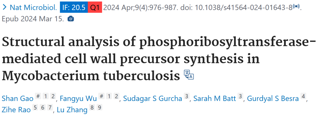 2024 年 3 月 15 日,上海科技大学张璐研究员、饶子和院士等人在 Nature Microbiology 期刊上发表题为「Structural analysis of phosphoribosyltransferase-mediated cell wall precursor synthesis in Mycobacterium tuberculosis」的文章,文章报道了结核分枝杆菌(Mtb)中膜结合的磷酸核糖转移酶(PRTase)Rv3806c 在供体(PRPP)和受体(DP)结合状态下的冷冻电镜结构。Rv3806c 在脂质环境中为三聚体,具有类似对羟基苯甲酸-聚异戊二烯转移酶基因(UbiA)超家族的折叠结构。每个原体由两个螺旋束组成,DP 和 PRPP 分别结合在膜内和膜外的腔中。研究通过突变和功能分析揭示了 Rv3806c 的催化机制,提出了通过反转机制进行磷酸核糖转移的模型。此外,Rv3806c 的突变与乙胺丁醇(EMB)耐药相关,棕榈酰 - 油酰 - 磷脂酰甘油(POPG)结合位点与临床 EMB 耐药突变相关。这些发现为 Mtb 细胞壁前体生物合成提供了结构基础,有助于抗结核药物的开发。