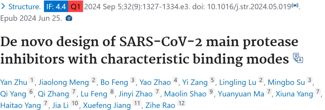 2024 年 6 月 25 日,上海科技大学饶子和院士、华东师范大学蒋雪峰教授在 Structure 期刊上发表了题为「De novo design of SARS-CoV-2 main protease inhibitors with characteristic binding modes」的文章,文章围绕 SARS-CoV-2 主蛋白酶(Mpro)展开,鉴于新冠疫情的影响以及现有药物面临的耐药性挑战,研究团队基于结构设计了一系列新型抑制剂。通过对抑制剂结构的合理设计与合成,包括以 DHMPK 为骨架、探索不同卤素弹头及取代基等,利用酶学测定法筛选并结合 X 射线晶体学解析复合物结构,确定了多种化合物与 Mpro 的结合模式及在不同位点的相互作用,最终获得了具有较强抑制活性的抑制剂,为 SARS-CoV-2 及其他病原体的半胱氨酸蛋白酶抑制剂开发提供了新线索和思路。