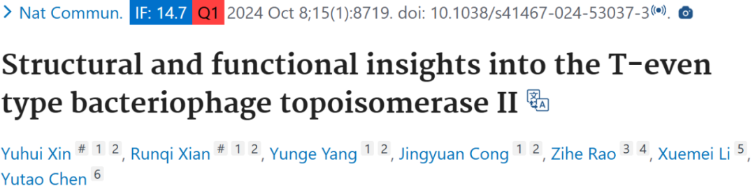 2024 年 10 月 8 日,中国科学院生物物理研究所饶子和院士、陈瑜涛副研究员在 Nature Communications 期刊上发表了题为「Structural and functional insights into the T-even type bacteriophage topoisomerase II」的文章,文章通过在大肠杆菌中表达和纯化 T4、T6 噬菌体拓扑异构酶 II 亚基,制备不同状态复合物,利用冷冻电镜和晶体学方法确定多种结构。这些结构包括 T4 和 T6 的无底物中央结构域、DNA 结合中央结构域等不同状态结构。揭示了 T - even 型噬菌体 Topo II 的结构和功能,为理解其机制提供了详细信息,对其进化研究有参考价值,还有助于开发相关抑制剂。
