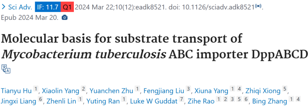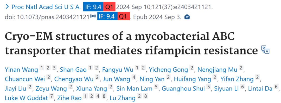 2024 年 9 月 3 日,上海科技大学张璐研究员、饶子和院士等人在 PNAS 期刊上发表了题为「Cryo-EM structures of a mycobacterial ABC transporter that mediates rifampicin resistance」的文章,该研究聚焦于结核分枝杆菌(Mtb)中可介导利福平耐药的 ABC 转运蛋白 Rv1217c - 1218c,通过多种实验技术确定了其在不同状态下的冷冻电镜(cryo - EM)结构,提供了 Rv1217c - 1218c 的结构基础,有助于理解 ABC 转运蛋白的 ATP 驱动构象变化和利福平结合位点,为对抗利福平耐药提供了新的思路和潜在靶点,如阻断周质门和关键氨基酸位点。同时,为进一步研究 ABC 转运蛋白的转运机制和工作模型提供了重要依据。