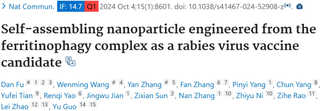 2024 年 10 月 4 日,南开大学郭宇教授,饶子和院士等人在 Nature Communications 期刊上发表题为「Self-assembling nanoparticle engineered from the ferritinophagy complex as a rabies virus vaccine candidate」的文章,该研究利用人铁蛋白重链(FTH1)和核受体辅激活因子 4(NCOA4)的铁蛋白吞噬复合物设计出通用的铁蛋白-适配器递送平台,解决了铁蛋白基疫苗面临的挑战。通过冷冻电镜解析复合物结构,设计并筛选出对铁蛋白结合亲和力显著提高的 16 氨基酸 Fagy - tag 肽。将狂犬病病毒(RABV)糖蛋白的 G 结构域 III(GDIII)与铁蛋白纳米颗粒结合构建出自组装疫苗。该疫苗具有高纯度、稳定性和免疫原性,能在小鼠体内诱导高效免疫反应,单剂量即可保护小鼠免受狂犬病病毒攻击,为开发针对多种病原体的疫苗提供了潜在策略。