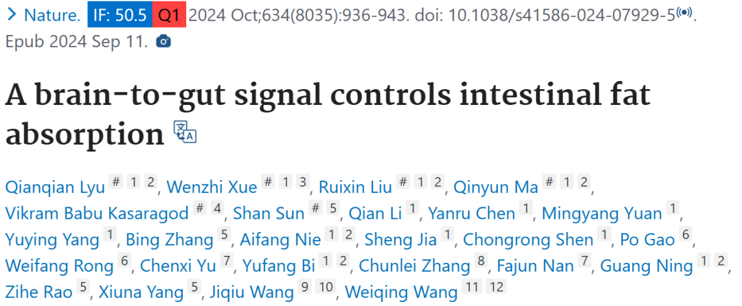 2024 年 9 月 11 日,上海交通大学医学院附属瑞金医院王卫庆教授和饶子和院士等人在 Nature 期刊上发表题为「A brain-to-gut signal controls intestinal fat absorption」的文章,该文章发现了大脑到肠道的信号控制肠道脂肪吸收的机制,揭示了背侧迷走神经核(DMV)在肠道脂肪吸收中的关键作用,以及通过调节 DMV -迷走神经-空肠轴来控制脂肪吸收的途径,为肥胖和代谢疾病的治疗提供了新的潜在策略。