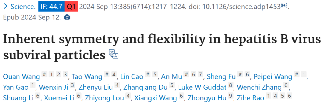 2024 年 9 月 13 日,中国科学院院士、清华大学教授、上海科技大学特聘教授饶子和与中国食品药品检定研究院胡忠玉研究员等人在 Science 期刊上发表题为「Inherent symmetry and flexibility in hepatitis B virus subviral particles」的文章,该文章解析了乙肝病毒表面抗原(HBsAg)在亚病毒颗粒(SVP)中的近原子分辨率结构,揭示了其组装规则、结构适应性以及与病毒衣壳的相互作用,为理解乙肝病毒的结构、组装机制以及病毒与宿主相互作用提供了重要基础。