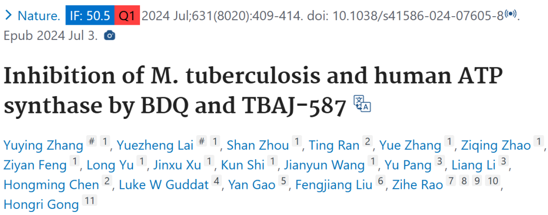 2024 年 7 月 3 日,南开大学生命科学学院贡红日教授、饶子和院士等人在 Nature 期刊上发表题为「Inhibition of M. tuberculosis and human ATP synthase by BDQ and TBAJ-587」的文章,该文章研究了 BDQ 和 TBAJ - 587 对结核分枝杆菌(Mtb)和人 ATP 合酶的抑制作用机制,通过解析相关的低温电子显微镜(cryo - EM)结构,为开发新型抗结核药物提供了结构基础,有助于理解两种 ATP 合酶在药物结合模式上的异同,为合理设计抗结核药物提供依据。