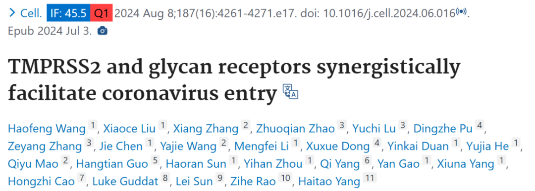 2024 年 7 月 3 日,上海科技大学免疫化学研究所杨海涛教授、清华大学饶子和院士等人在 Cell 期刊上发表题为「TMPRSS2 and glycan receptors synergistically facilitate coronavirus entry」的文章,该文章研究了新冠病毒 HCoV - HKU1 进入宿主细胞过程中,跨膜丝氨酸蛋白酶 2(TMPRSS2)和糖蛋白受体(sialoglycan)的协同作用机制。通过解析不同状态下 HCoV - HKU1 刺突蛋白(spike)的低温电子显微镜(cryo - EM)结构,深入了解病毒与宿主细胞相互作用的分子机制,为开发针对冠状病毒感染的治疗方法提供理论基础。