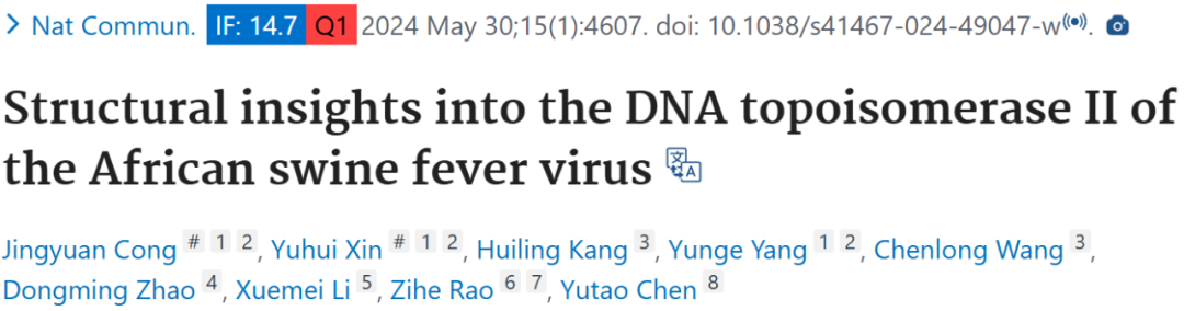 2024 年 5 月 30 日,中国科学院生物物理研究所饶子和院士、陈瑜涛副研究员在 Nature Communications 杂志期刊上发表了题为「Structural insights into the DNA topoisomerase II of the African swine fever virus」的文章,该研究使用冷冻电镜(cryo - EM)、X 射线晶体学和生化分析等方法,对非洲猪瘟病毒(ASFV)编码的 II 型拓扑异构酶 pP1192R 进行结构和功能研究。确定了 pP1192R 在不同构象状态下的结构,包括 pP1192R - dsDNA 复合物的冷冻电镜结构以及 ATP 酶结构域与腺苷 - 5′-(β,γ- 亚氨基)三磷酸(AMPPNP)和腺苷二磷酸(ADP)复合物的晶体结构,并证实其体外酶活性。pP1192R 与真核生物拓扑异构酶 II(Topo II)虽氨基酸序列相似度低,但结构相似。其结构包含 GHKL、传感器(Transducer)等多个亚结构域,通过分析其与 DNA 的相互作用以及不同构象下的变化,阐述了其催化机制,包括 G - segment(DNA 双链中的一段)切割、T - segment(DNA 双链中的另一段)转运和 G - segment 重新连接等过程。还发现 pP1192R 倾向于结合 DNA 交叉区域,并通过分子对接预测了一些潜在抑制剂。这些结果为病毒 II 型拓扑异构酶的基本机制提供了见解,有助于理解其进化轨迹,为非洲猪瘟的防治提供潜在策略。