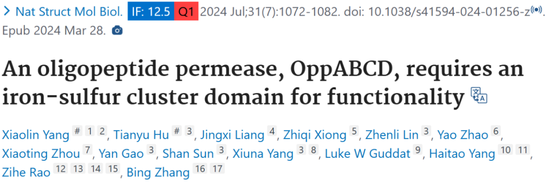 2024 年 3 月 28 日,上海科技大学免疫化学研究所张兵副研究员、饶子和院士等人在 Nature Structural & Molecular Biology 期刊上发表题为「An oligopeptide permease, OppABCD, requires an iron–sulfur cluster domain for functionality」的文章。该研究利用冷冻电镜技术确定了结核分枝杆菌(Mtb)中寡肽通透酶 OppABCD 在不同状态下的高分辨率结构,包括静息态、寡肽结合的预转移态、腺苷 - 5′-(β,γ- 亚氨基)三磷酸(AMPPNP)结合的预催化中间态和 ATP 结合的催化中间态。OppABCD 由底物结合蛋白 OppA、跨膜亚基 OppB 和 OppC 以及含两个核苷酸结合结构域(NBDs)的 ATP 酶 OppD 组成。研究发现 OppD 的两个 NBDs 之间存在一个功能性必需的 [4Fe–4S] 簇结合结构域。通过这些结构研究,揭示了 OppABCD 的寡肽识别和转运机制,探讨了 OppABCD 对不同寡肽的识别偏好等,为理解 ABC 转运蛋白的底物转运机制提供了新视角。