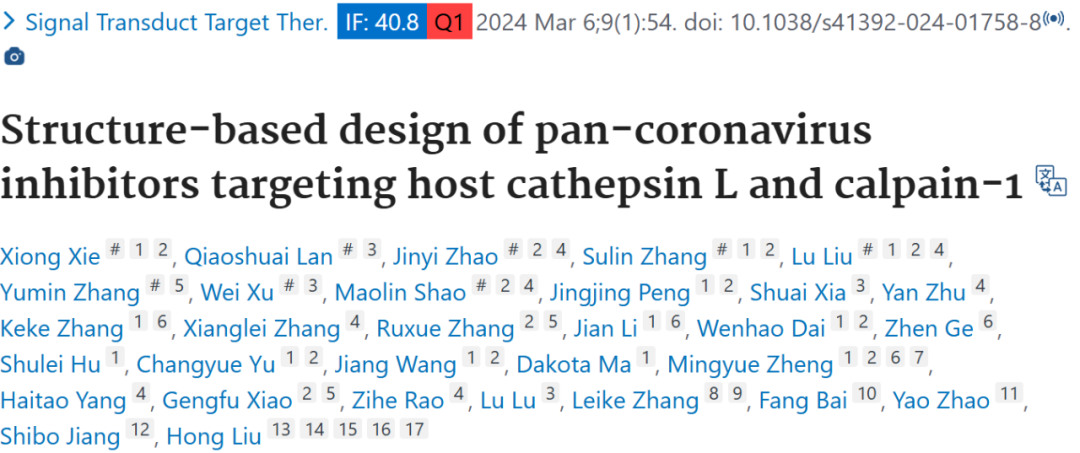 2024 年 3 月 6 日,中国科学院上海药物研究所柳红研究员、上海科技大学饶子和院士等人在 Signal Transduction and Targeted Therapy 期刊上发表题为「Structure-based design of pan-coronavirus inhibitors targeting host cathepsin L and calpain-1」的文章,文章主要介绍了为应对冠状病毒感染开发泛冠状病毒抑制剂的研究。通过基于结构的药物设计合成了两种化合物,它们能双重抑制宿主组织蛋白酶 L(CTSL)和钙蛋白酶 - 1(CAPN1)。解析了相关复合物的晶体结构,明确结合模式。经研究发现,这两种化合物在体外对多种冠状病毒有广谱抗病毒活性,对 SARS - CoV - 2 及其变异株效力显著,可能通过阻断病毒进入发挥作用。它们在体内有良好药代动力学特性和安全性,在相关小鼠模型中对 SARS - CoV - 2 XBB 1.16 变异株及 HCoV - OC43 感染有抗病毒效力,还在巨噬细胞和小鼠肺炎模型中显示出抗炎效果,是有潜力的药物候选物,为开发相关抑制剂提供了新思路。