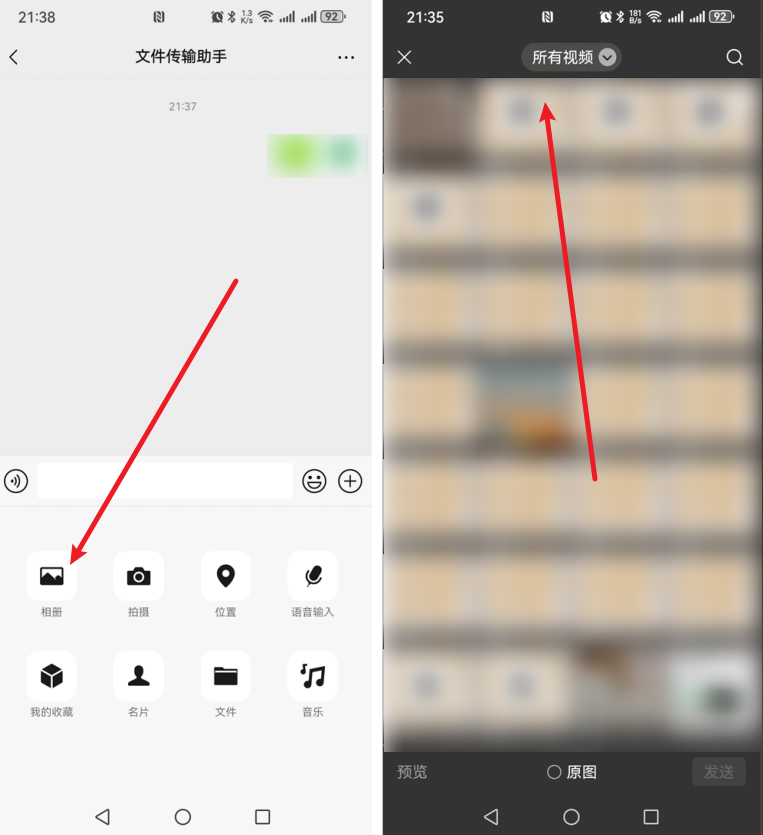 2、然后再点击【相册】选项,最后在相册中找到你要穿的视频后点击【发送】就可以了。