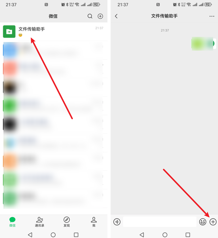 1、进入微信后,在聊天界面中找到并点击【文件传输助手】,如果界面中没有可以通过“放大镜”搜索找到并打开,接着在聊天框下点击右下角的【+】号;
