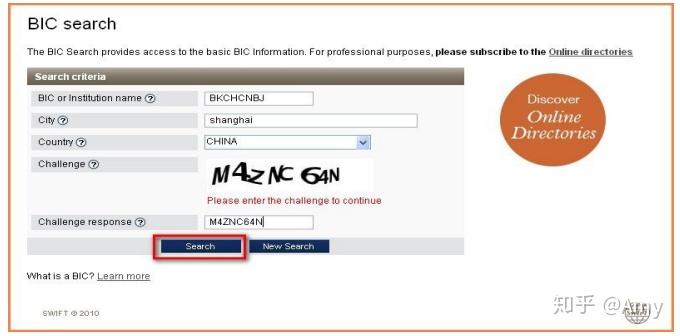 以中国银行上海分行为例,登录Swift国际网站查询页面后,根据提示填入您查询的银行信息。