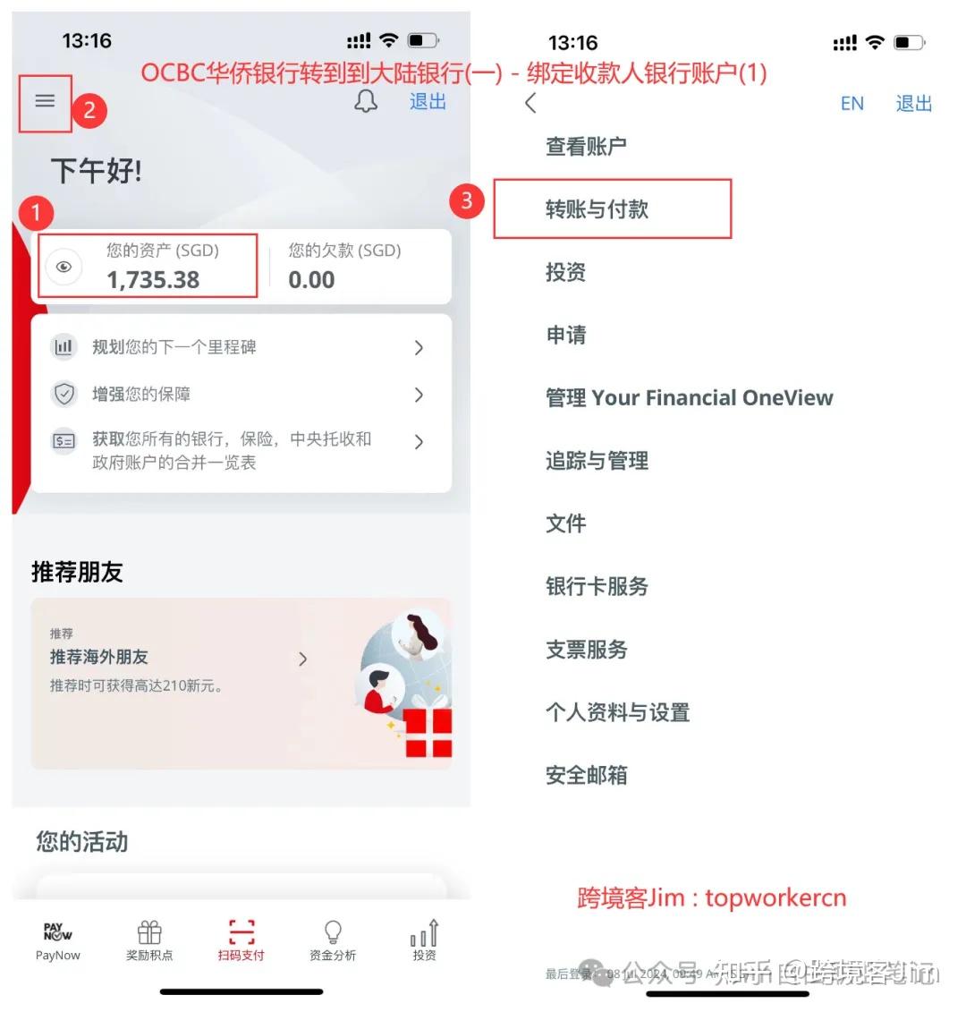 等待12个小时后,我们再次登录OCBC华侨银行的手机app, 左上角——>菜单栏——>转账与付款——>海外, 开始转账到上一步绑定的中国大陆中国银行的账户。