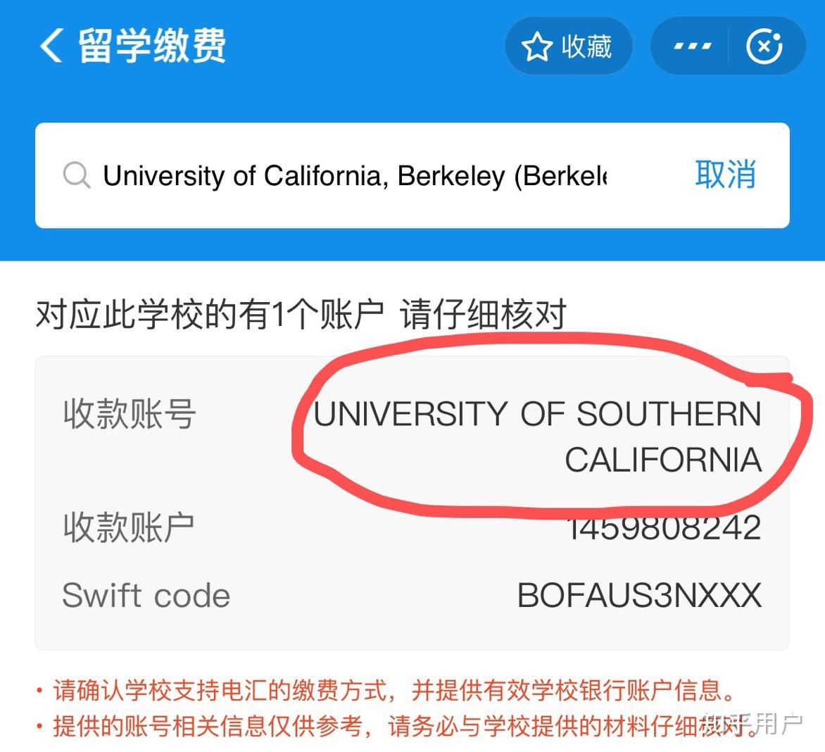 我是UCB的,8/23就要Due学费了,之前看到有手续费全免活动我就想今天还能赶得上。点开支付宝之后,翻了半天没翻到留学缴费的图标,又去翻之前营销广告的推文,搜【跨境汇款】才找到。然后我搜UCB,显示搜不到,我就又输入全称。然后我就惊呆了…..