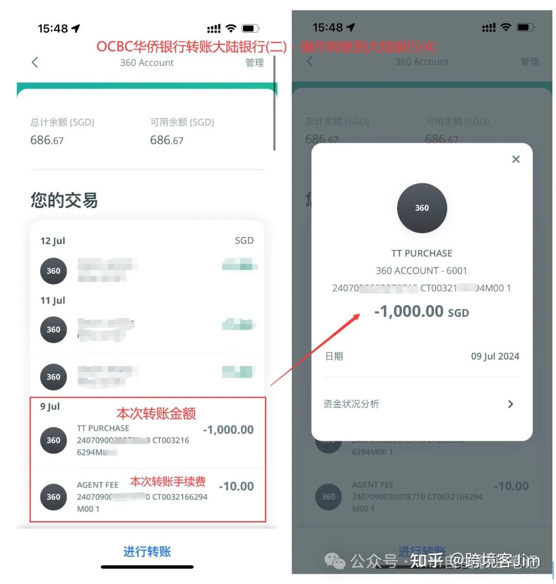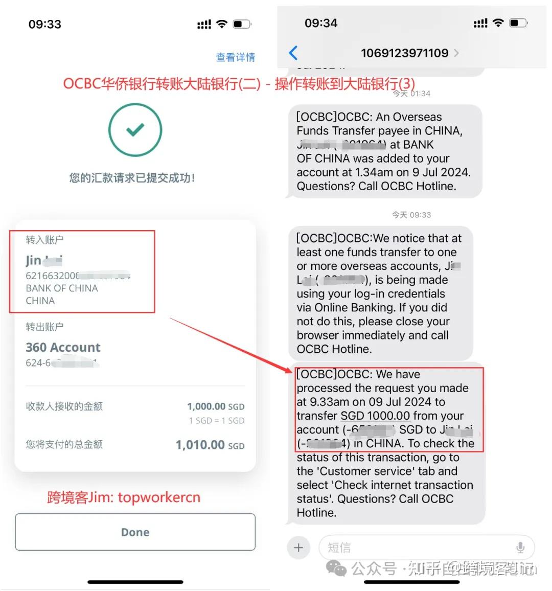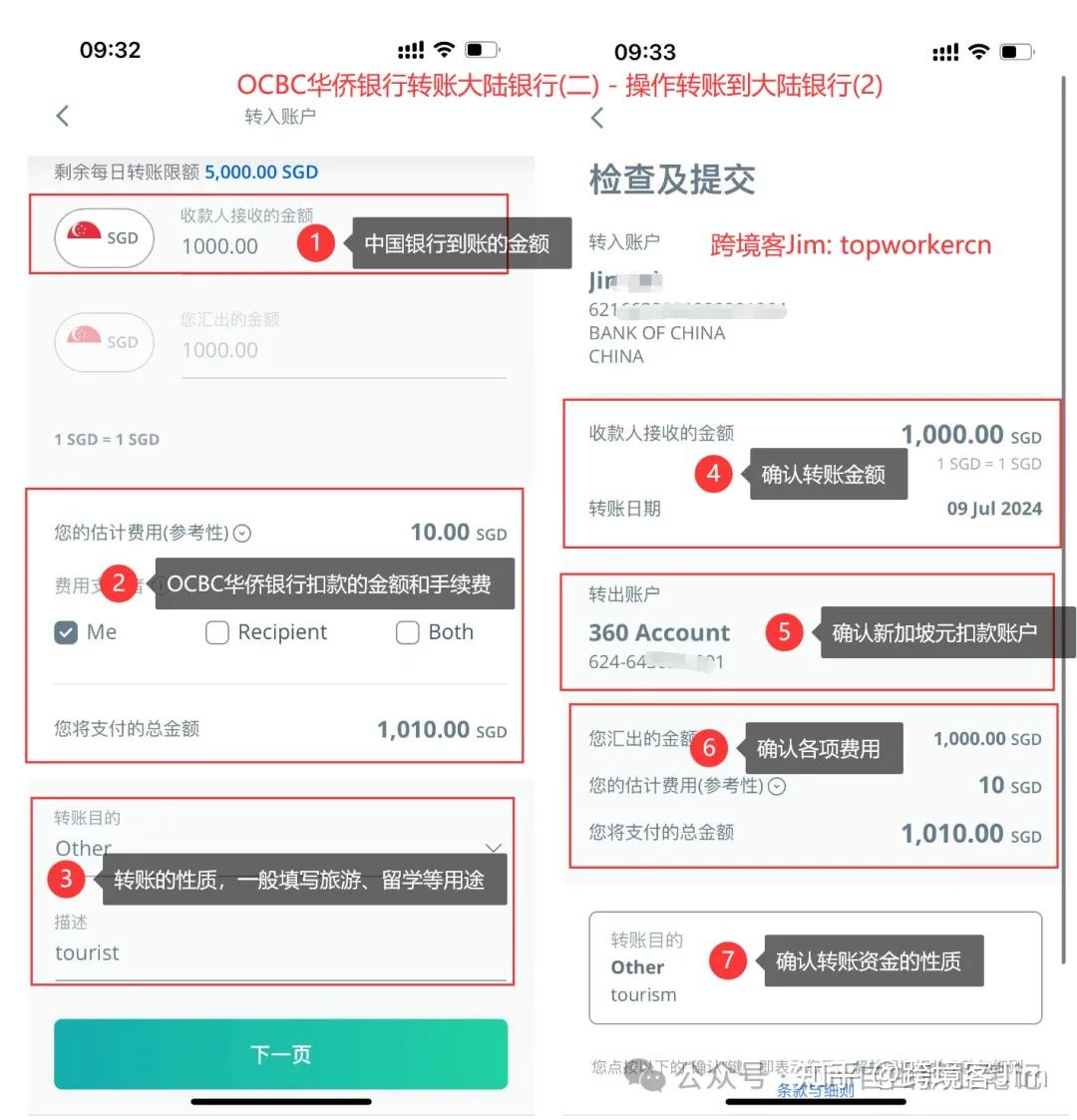也就是说最终中国银行会到账1000新加坡元,而OCBC华侨银行的账户余额会减少1010新加坡元。