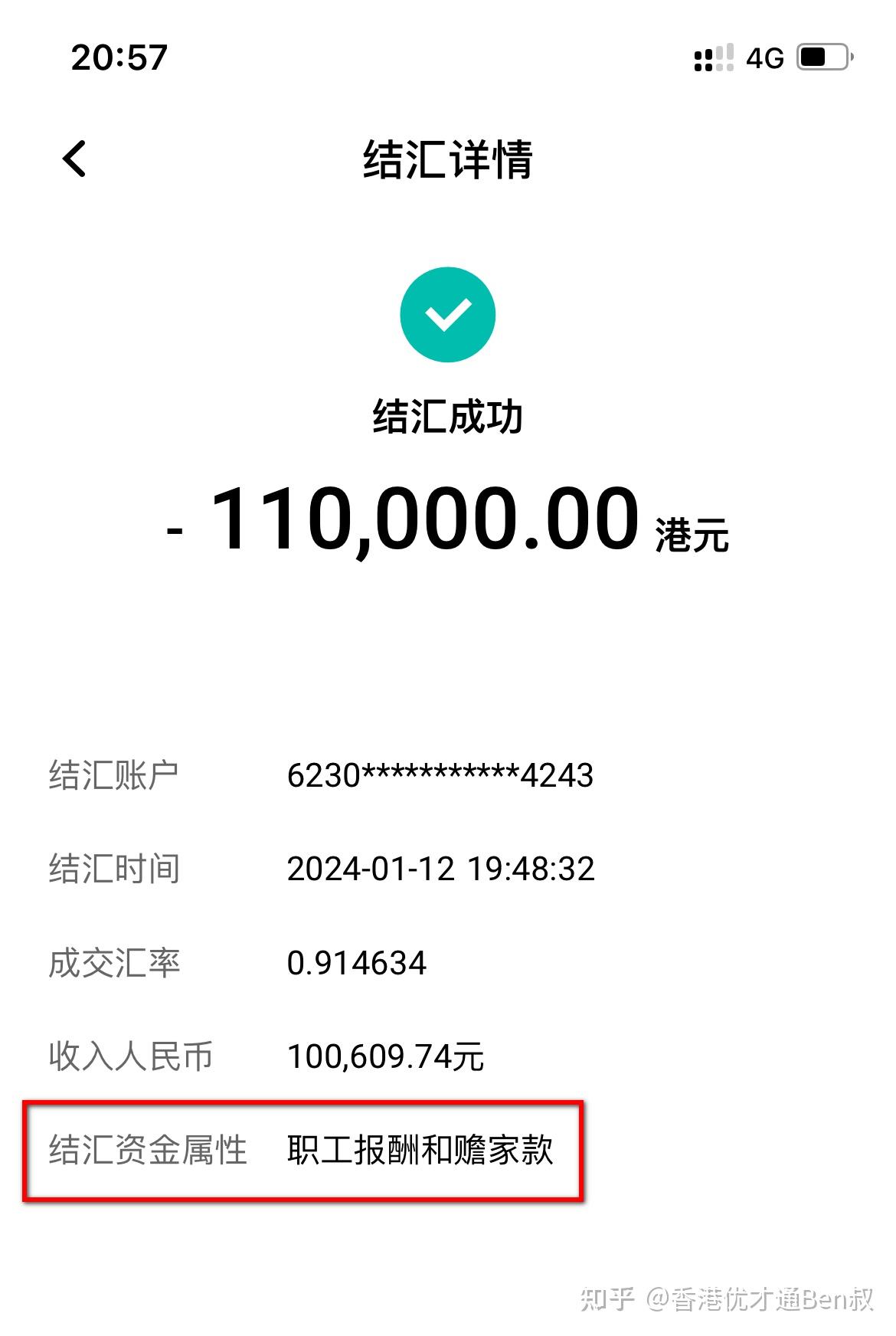 接下来等待银行的人工处理,两个半小时之后就收到了入账短信通知(这个时候港币外汇已经入账个人账号),如下图,