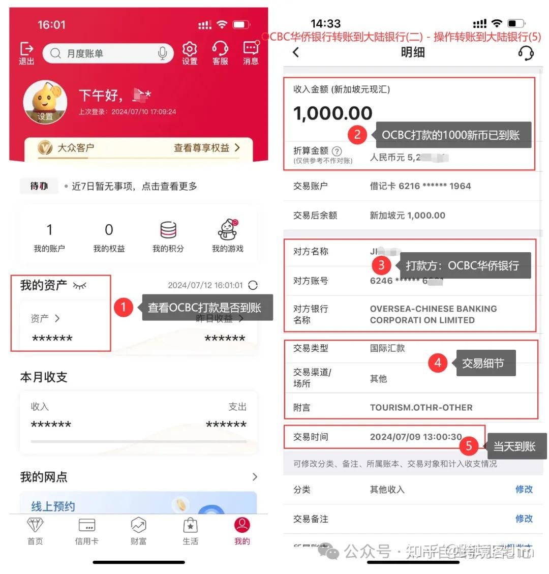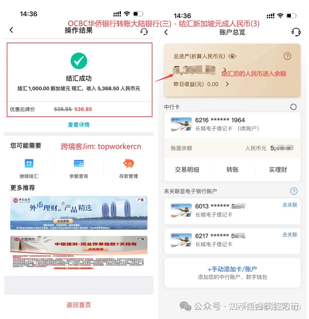 如图所示,从新加坡OCBC华侨银行转账到大陆银行的新加坡元金额结汇后的人民币金额自动进入中国银行的账户余额。