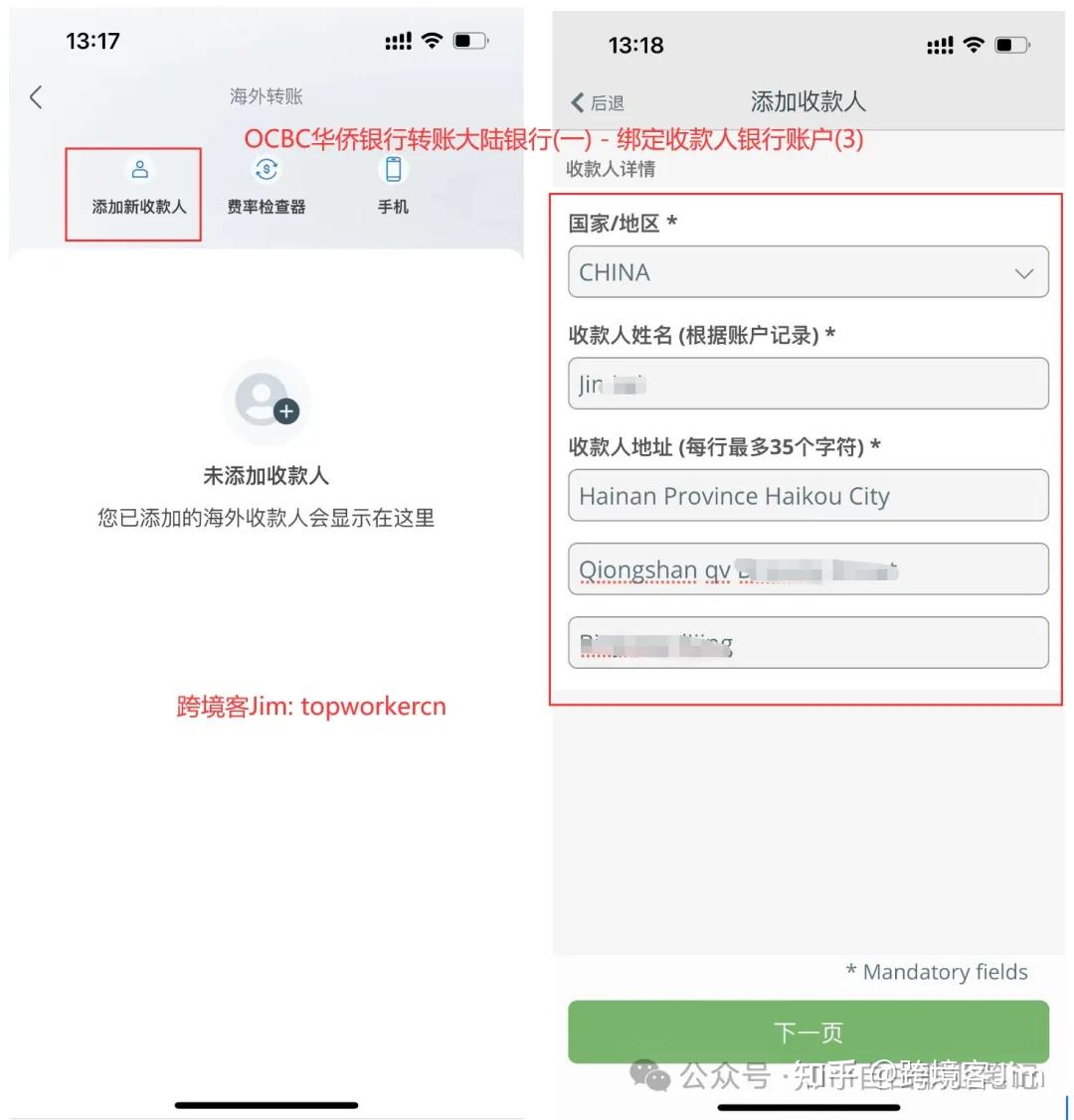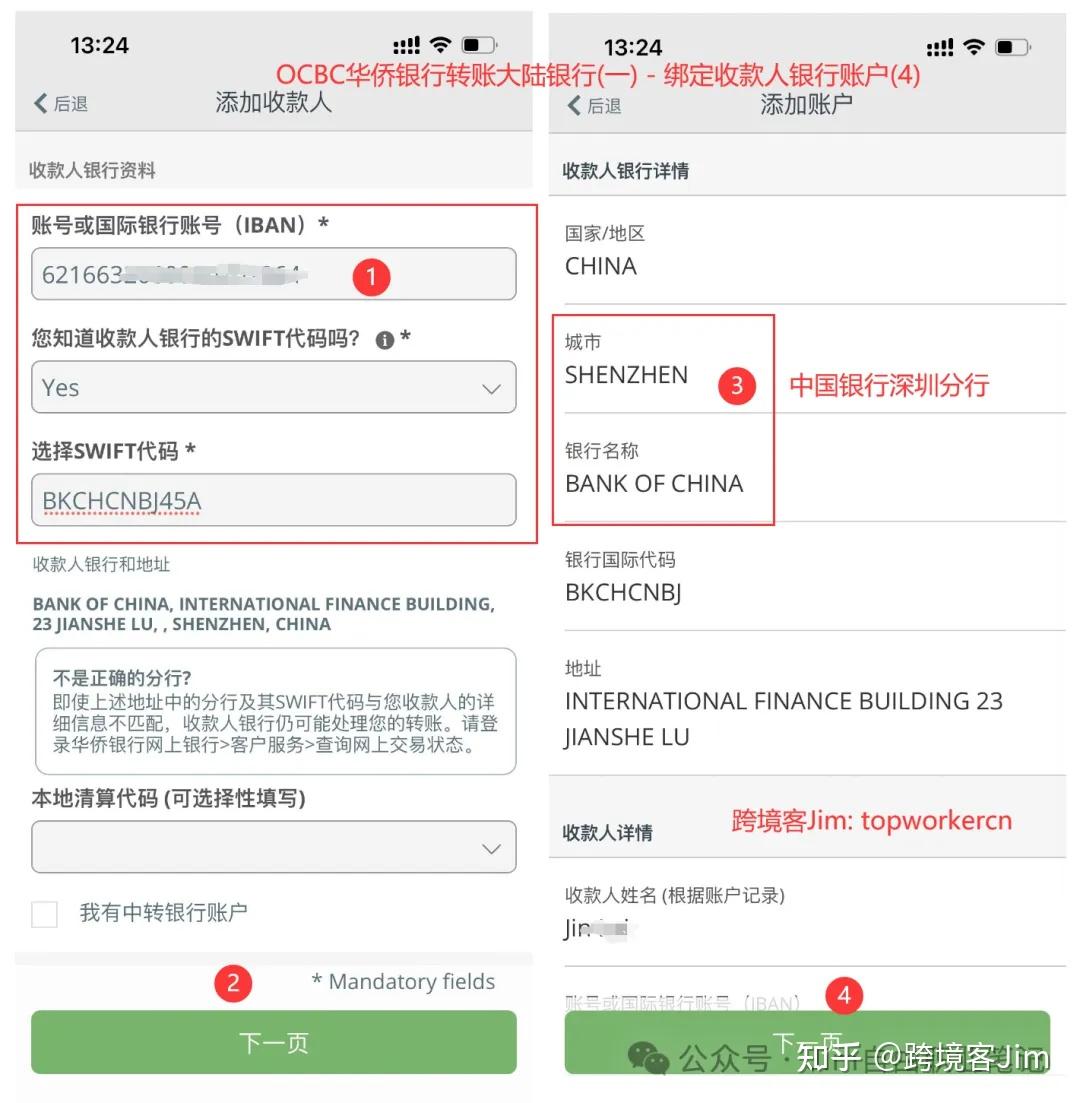 - ①新加坡OCB华侨银行转账到国内银行的时候需要先绑定收款人,即先绑定国内的银行账户信息,笔者是绑定了同名的大陆境内中国银行账户;