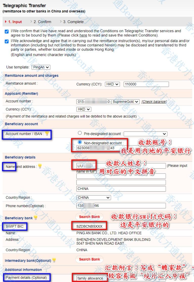 我用的是香港的东亚银行 – 网上银行,其他任何地方的银行都是类似的逻辑,就是填写几个关键字段,如下图所示: