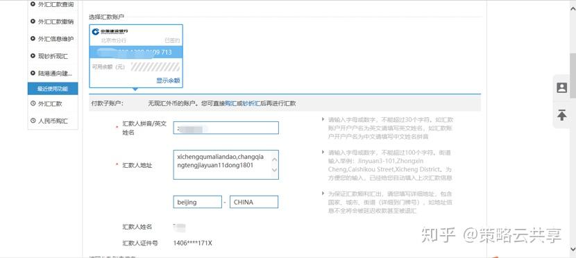 2.选择汇款账户,填写汇款信息(汇款人拼音、汇款人地址、姓名、证件等)。