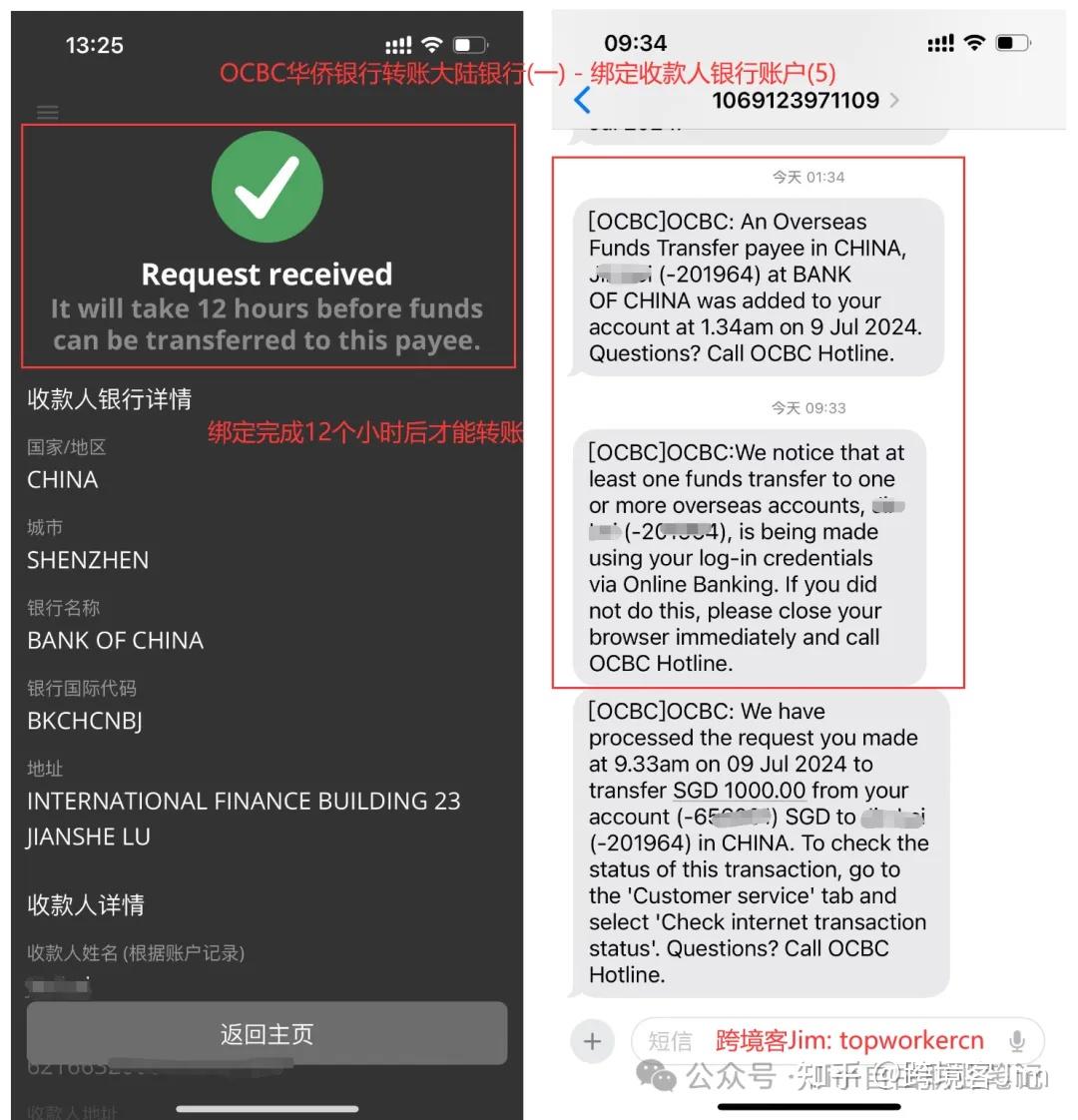 - ②收款人绑定到OCBC华侨银行以后,需要等待12~24小时完成账户验证和审核后才能进行转账;