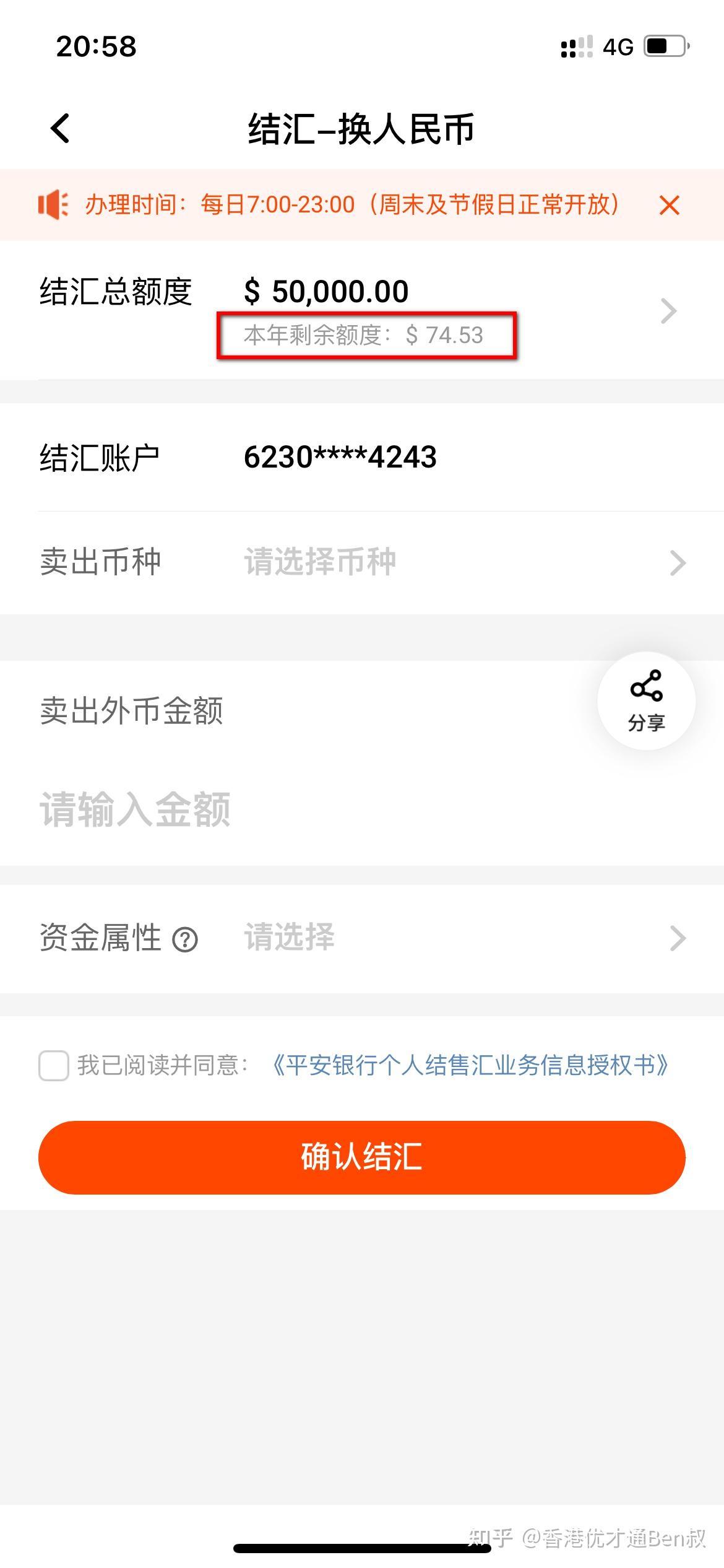 btw,在结汇页面,可以看到本人本年度的剩余额度。如下图,